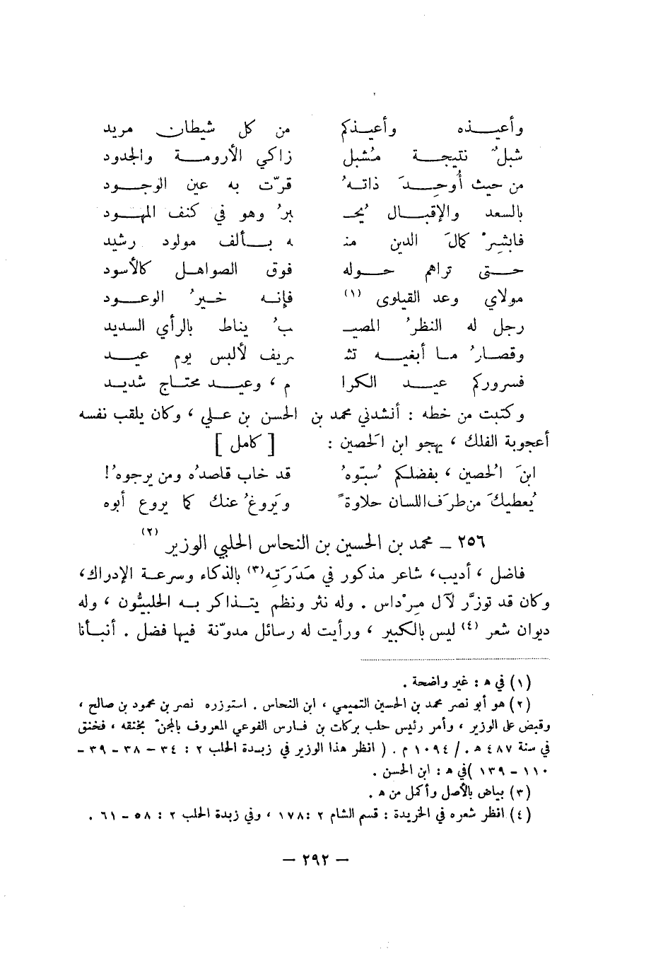 يُعطيكَ من طرَف اللسان حلاوةًويَروغُ عنك كما يروع أبوه 256 محمد بن الحسين بن النحاس الحلبي الوزير
