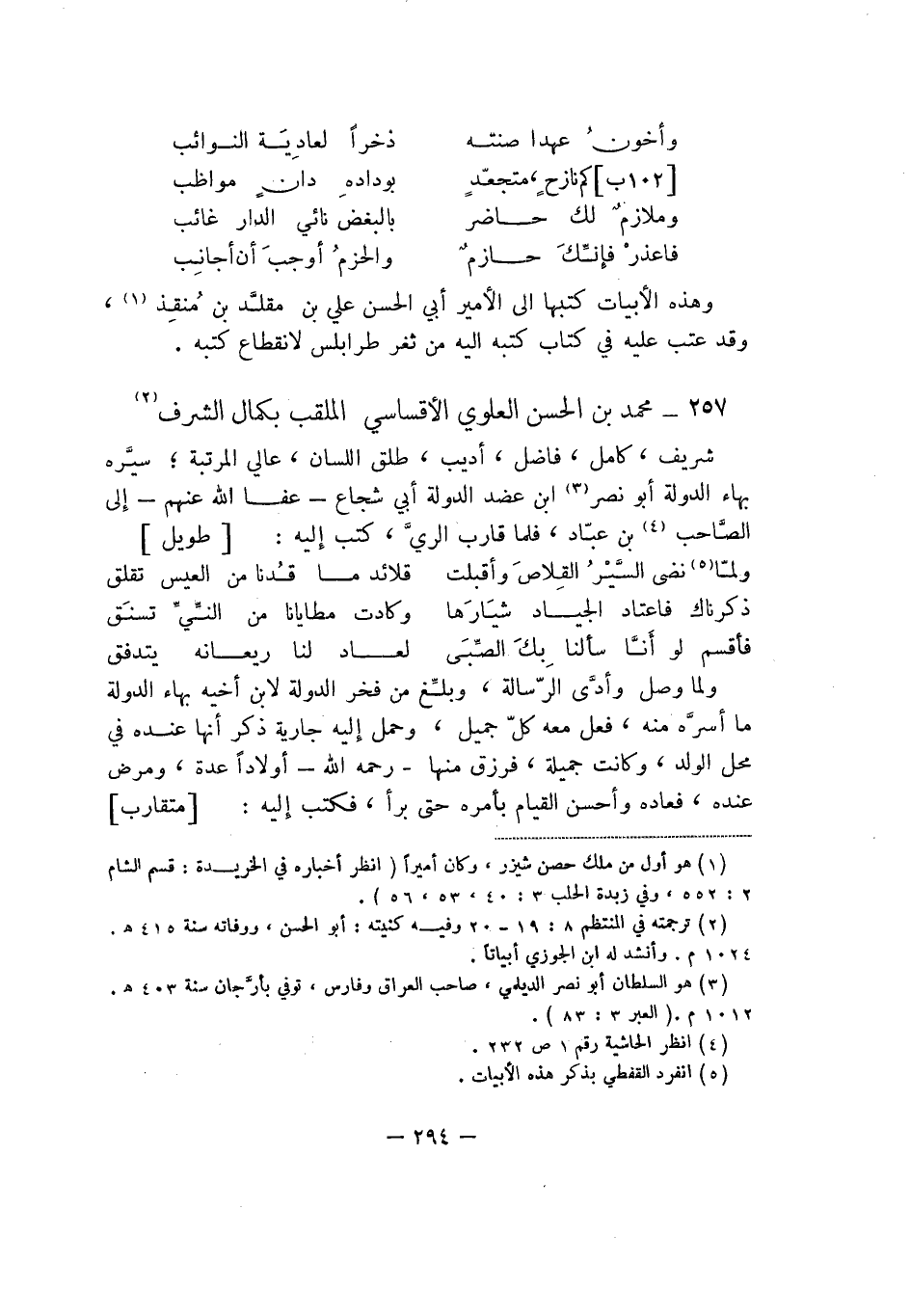 257 - محمد بن الحسن العلوي الأقساسي الملقب بكمال الشرف شريف، كامل، فاضل، أديب، طلق اللسان، عالي المرتبة، سيَّره بهاء الدولة أبو نصر ابن عضد الدولة أبي شجاع - عفا الله عنهم - إلى الصَّاحب بن عباد، فلما قارب الريَّ، كتب إليه طويل