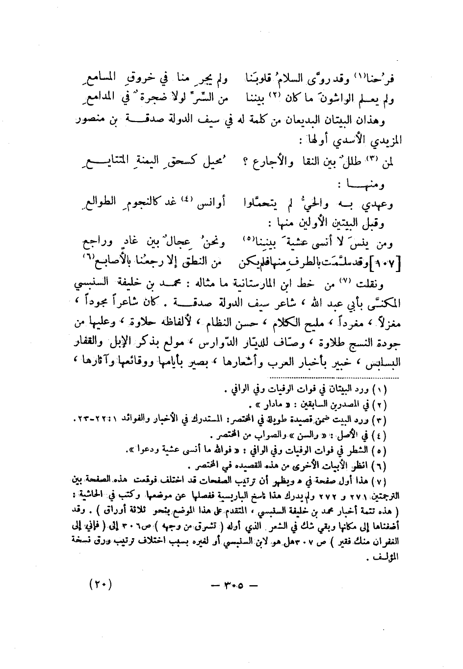 ونقلت من خط ابن المارستانية ما مثاله: محمد بن خليفة السنبسي المكنّى بأبي عبد الله، شاعر سيف الدولة صدقة. كان شاعراً مجوداً، مغزلاً، مغرداً، مليح الكلام، حسن النظام، لألفاظه حلاوة، وعليها من جودة النسج طلاوة، وصّاف للدّيار الدّوارس، مولع بذكر الإبل والقفار البسابس، خبير بأخبار العرب وأشعارها، بصير بأيامها ووقائعها وآثارها،