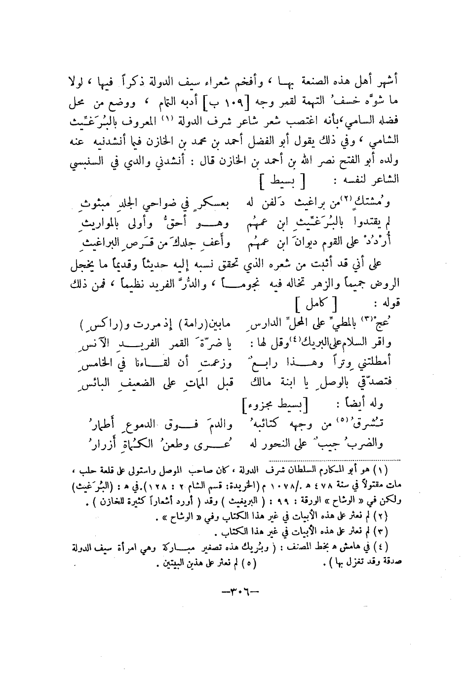 أشهر أهل هذه الصنعة بها، وأفخم شعراء سيف الدولة ذكراً فيها، لولا ما شوَّه خسف التهمة لقمر وجه أدبه التمام، ووضع من محل فضله السامي، بأنه اغتصب شعر شاعر شرف الدولة المعروف بالبُرَغِّيث الشامي، وفي ذلك يقول أبو الفضل أحمد بن محمد بن الخازن قال أنشدنيه عنه ولده أبو الفتح نصر الله أحمد بن الخازن قال: أنشدني والدي في السنبسي الشاعر لنفسه: بسيط: