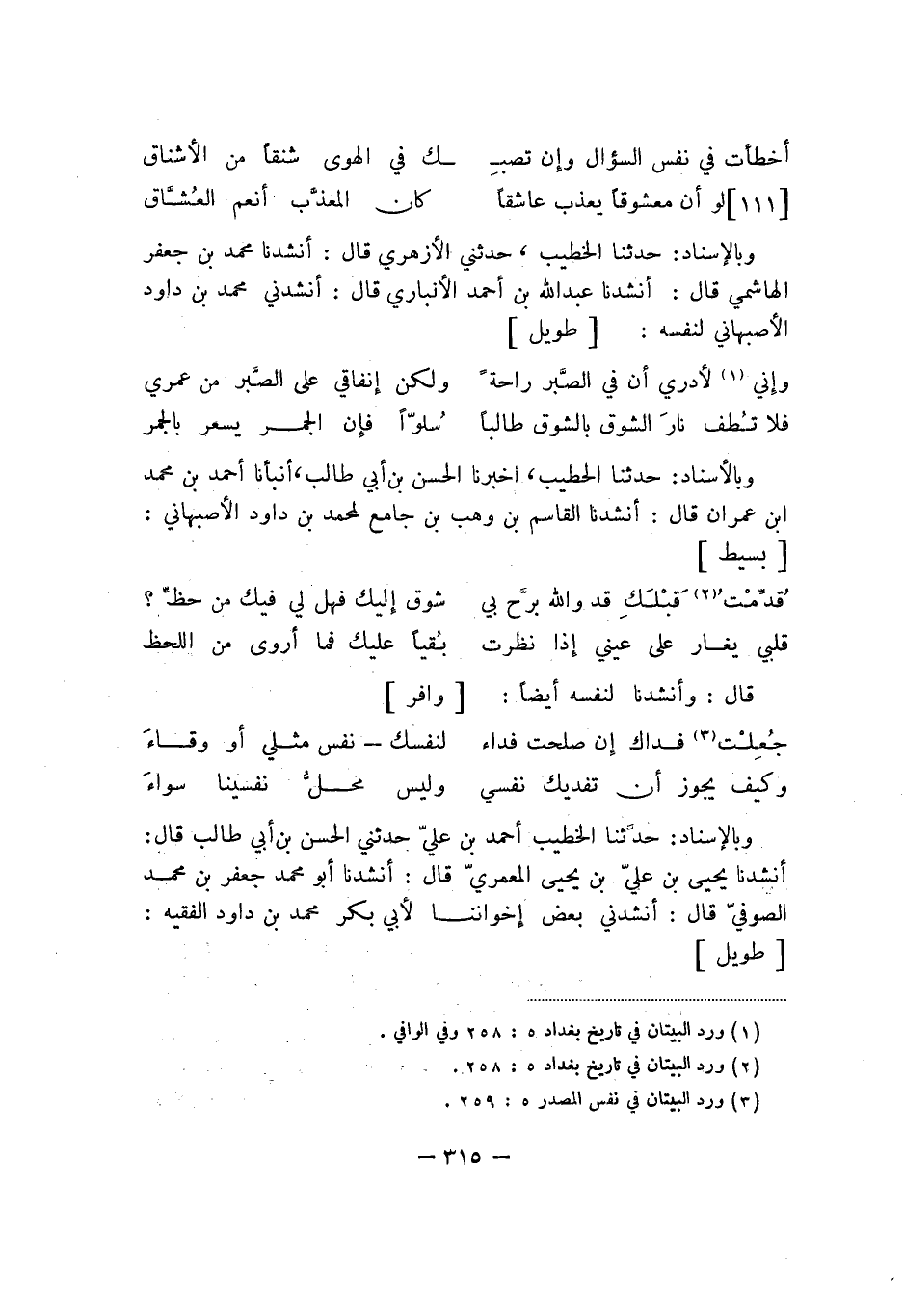 وبالإسناد: حدثنا الخطيب أحمد بن علي حدثني الحسن بن أبي طالب قال: أنشدنا يحيى بن علي بن يحيى المعمّري قال: أنشدنا أبو محمد جعفر بن محمد الصوفي قال: أنشدنا بعض إخواننا لأبي بكر محمد بن داود الفقيه: طويل: