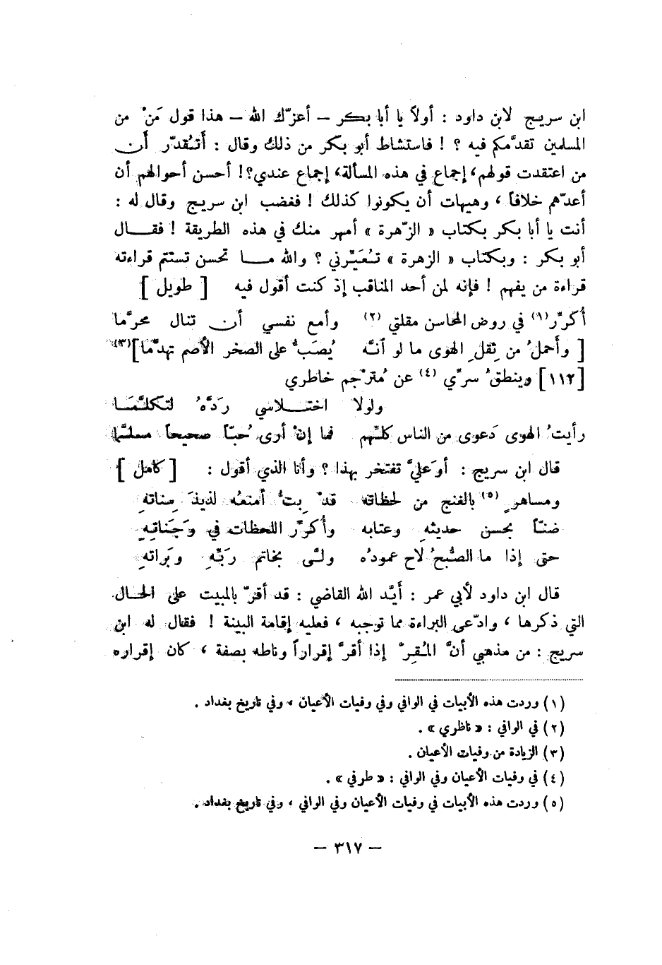 ابن سريج لابن داود: أولاً يا أبا بكر - أعزك الله - هذا قول مَنْ من المسلمين تقدَّمكم فيه؟! فاستشاط أبو بكر من ذلك وقال: أتقدر أن من اعتقدت قولهم، إجماع في هذه المسألة، إجماع عندي؟! أحسن أحوالهم أن أعدّهم خلافاً، وهيهات أن يكونوا كذلك! فغضب ابن سريج وقال له: أنت يا أبا بكر بكتاب " الزهرة " أمهر منك في هذه الطريقة! فقال أبو بكر: وبكتاب " الزهرة " تُعيّرني؟ والله ما تحسن تستتم قراءته قراءة من يفهم! فإنه لمن أحد المناقب إذ كنت أقول فيه: طويل: أُكرِّر في روض المحاسن مقلتي وأمع نفسي أن تنال محرَّما