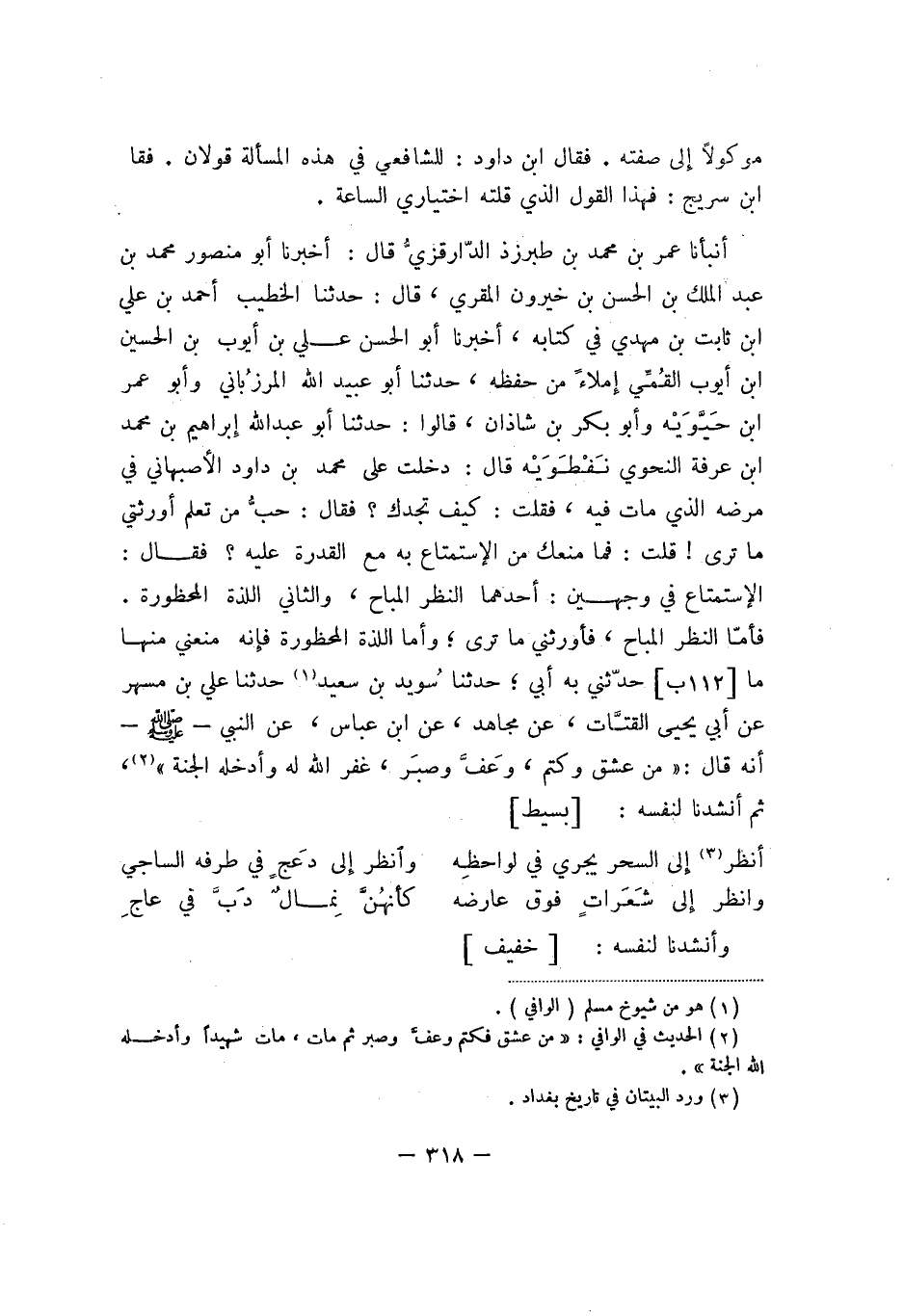 أنبأنا محمد بن محمد بن طبرزذ الدّارقزيّ قال: أخبرنا أبو منصور محمد بن عبد الملك بن الحسن بن خيرون المقري، قال: حدثنا الخطيب أحمد بن علي ابن ثابت بن مهدي في كتابه، أخبرنا أبو الحسن علي بن أيوب بن الحسين ابن أيوب القُمِّي إملاء من لفظه، حدثنا أبو عبيد الله المرزُباني وأبو عمر ابن حَيَّوَيه وأبو بكر بن شاذان، قالوا: حدثنا أبو عبد الله إبراهيم بن محمد ابن عرفة النحوي نفطويه قال: دخلت على محمد بن داود الأصبهاني في مرضه الذي مات فيه، فقال: كيف تجدك؟ فقال: حبُّ من تعلم أورثني ما ترى! قلت: فما منعك من الاستمتاع به مع القدرة عليه؟ فقال: الاستمتاع في وجهين: أحدهما النظر المباح، والثاني اللذة المحظورة. فأمّا النظر المباح، فأررثني ما ترى، وأما اللذة المحظورة فأنه منعني منها ما حدثني به أبي، حدثنا سُويد بن سعيد حدثنا علي بن مسهر عن أبي يحيى القتّات، عن مجاهد، عن ابن عباس، عن النبي - (- أنه قال: " من عشق وكتم، وعفَّ وصبر، غفر الله له وأدخل الجنة "، ثم أنشدنا لنفسه: بسيط: