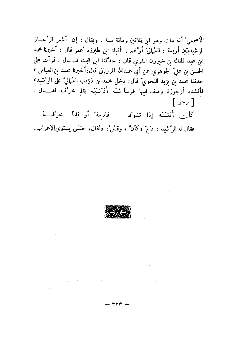 الأصمعي أنه مات وهو ابن ثلاثين ومائة سنة. ويقال: إن أشعر الرُّجاز الرشيديين أربعة: العماني أوّلهم. أنبأنا ابن طبرزد عمر قال: أخبرنا محمد ابن عبد الملك بن خيرون المقري قال: حدثنا ابن ثابت قال: قرأت على الحسن بن علي الجوهري عن أبي عبد الله المرزباني قال: أخبرنا محمد بن العباس، حدثنا محمد بن يزيد النحوي قال: دخل محمد بن ذؤيب العماني على الرشيد، فأنشده أرجوزة وصف فيها فرساً شبّه أُذنيه بقلم محرّف فقال: رجز: