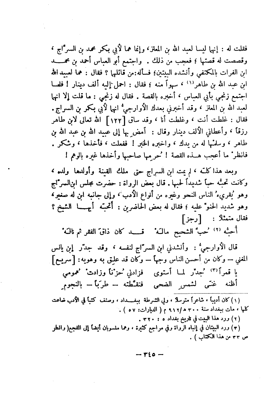 فقلت له: إنهما ليسا لعبد الله بن المعتز، وإنما هما لأبي بكر محمد بن السراج، وقصصت له قصتها؛ فعجب من ذلك. واجتمع أبو العباس أحمد بن محمد ابن الفرات بالمكتفي وأنشده البيتين؛ فسأله: من قائلهما؟ فقال: هما لعبيد الله ابن عبد الله بن طاهر، سهواً منه؛ فقال: أحمل إلية ألف دينار! فلما اجتمع زنجي بأبي العباس، أخبره بالقصة. فقال له زنجي: ما قلت إلا أنهما لعبد الله بن المعتز، وقد أخبرني بعدك الأوارجيّ أنهما لأبي بكر بن السرّاج. فقال: غلطت أنت، وغلطت أنا، وقد ساق الله تعالى لابن طاهر رزقاً، وأعطاني الألف دينار وقال: امضِ بها إلى عبيد الله بن عبد الله بن طاهر، وسلّمها له من يدك، وأخبره الخبر! ففعلت، فأخذها، وشكر. فانظرْ ما أعجب هذه القصة! حُرِمها صاحبها وأخذها غيره بالوهم!