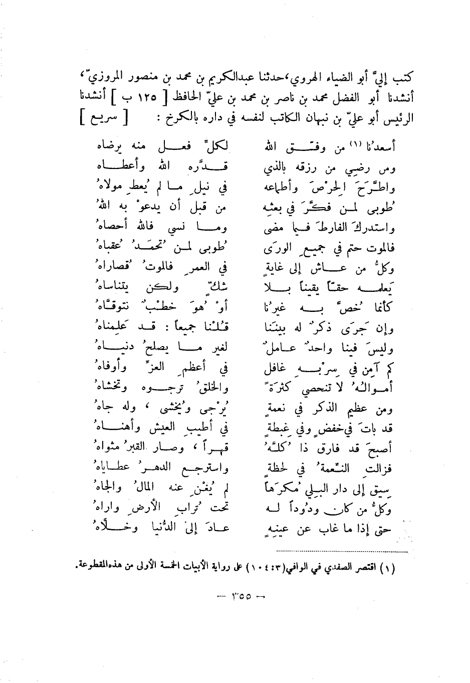 كتب إليّ أبو الضياء الهروي، حدثنا عبد الكريم بن محمد بن منصور المررزي، أنشدنا أبو الفضل محمد بن ناصر بن محمد بن عليّ الحافظ أنشدنا الرئيس أبو علي بن نبهان الكاتب لنفسه في داره بالكرخ: سريع: أسعدُنا من وفّق الله لكلِّ فعل منه يرضاه