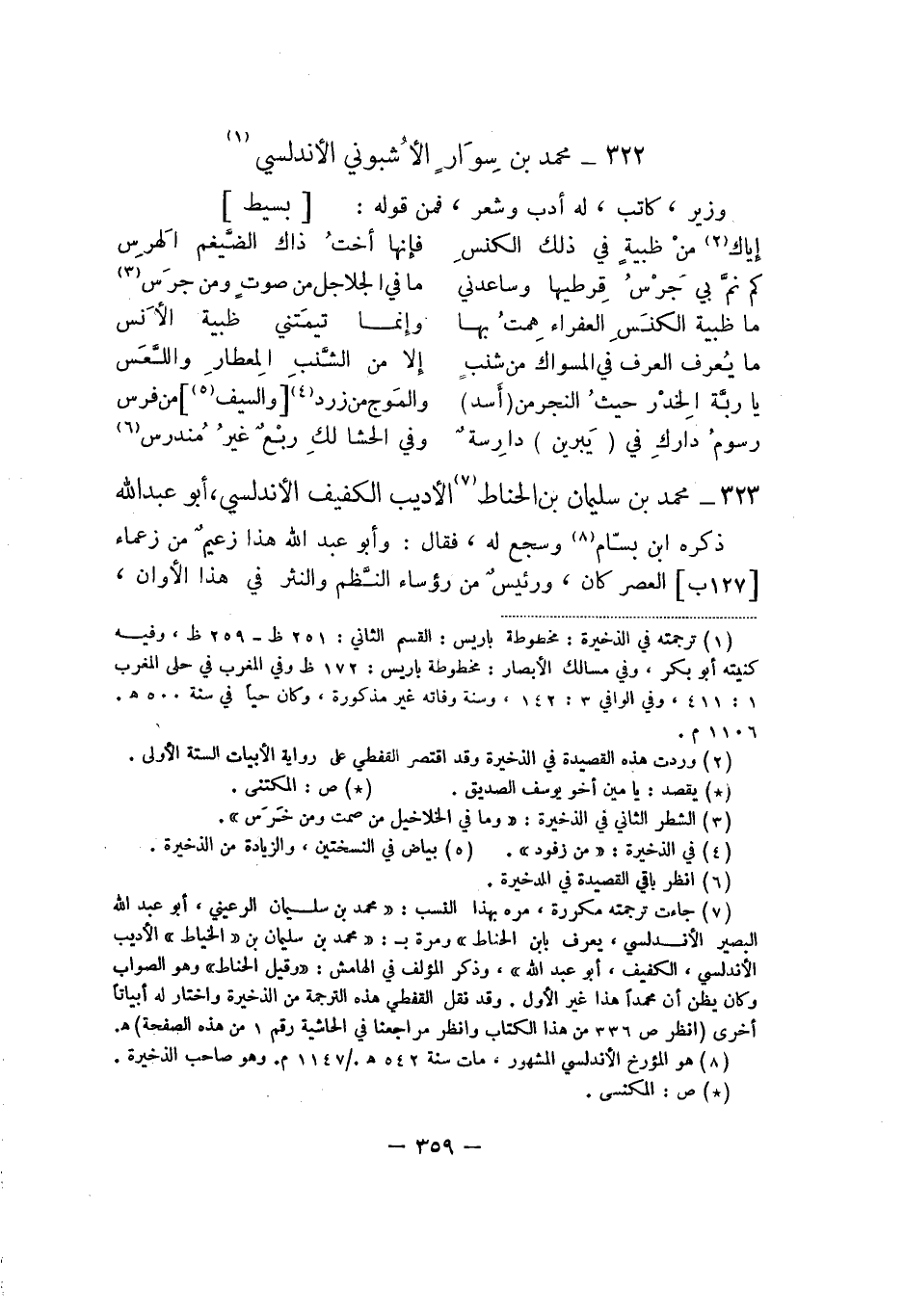 323 - محمد بن سليمان بن الحناط الأديب الكفيف الأندلسي، أبو عبد الله ذكره ابن بسّام وسجع له، فقال وأبو عبد الله هذا زعيم من زعماء العصر كان، ورئيس من رؤساء النَّظم والنثر في هذا الأوان،