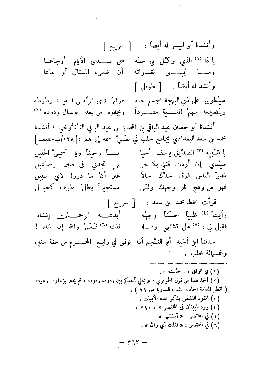 أنشدنا أبو حصين عبد الباقي بن المحسن بن عبد الباقي التنُّوخي، أنشدنا محمد بن سعد البغدادي بجامع حلب في صّبيّ اسمه إبراهيم: خفيف