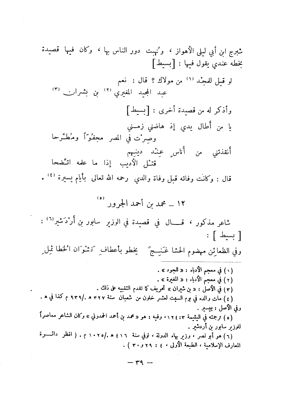 شاعر مذكور، قال في قصيدة في الوزير سابور بن أَرْدَشير: بسيط: