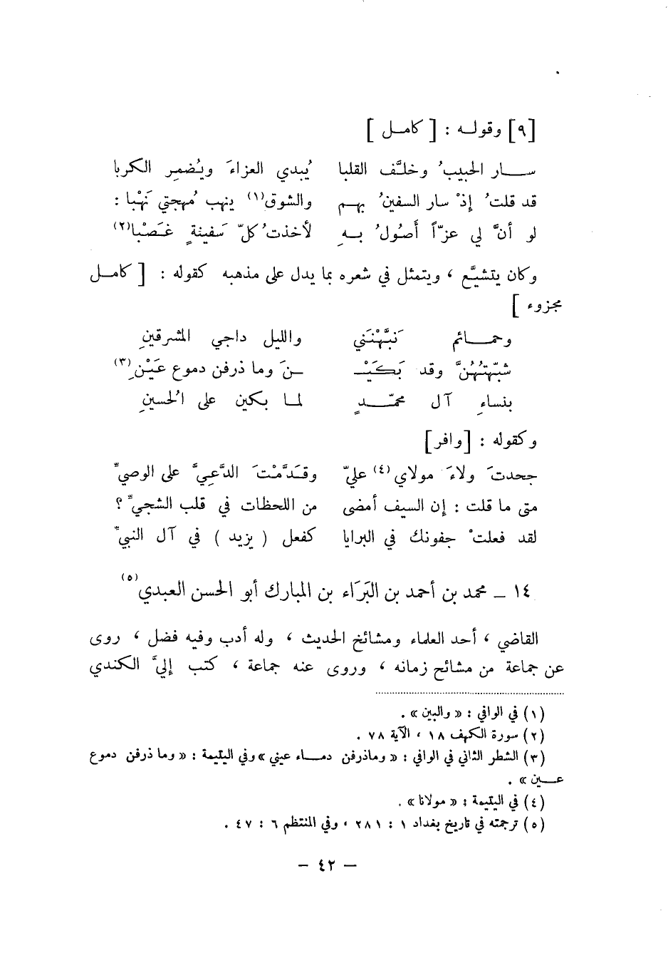 وكان يتشيَّع، ويتمثل في شعره بما يدل على مذهبه كقوله: كامل مجزوء