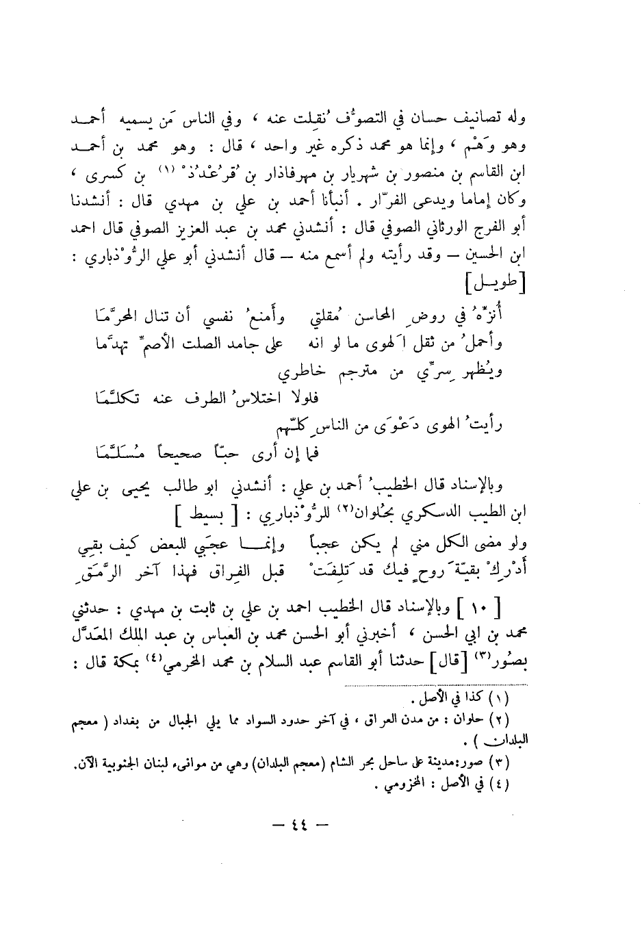 وله تصانيف حسان في التصوّف نُقلت عنه، وفي الناس من يسميه أحمد وهو وَهْم، وإنما هو محمد ذكره غير واحد، قال: وهو محمد بن أحمد ابن القاسم بن منصور بن شهريار بن مهرفاذار في قُرُعْدُذْ بن كسرى، وكان إماماً ويدعى الفرّار. أنبأنا أحمد بن علي بن مهدي قال: أنشدنا، أبو الفرج الورثاني الصوفي قال: أنشدني محمد بن عبد العزيز الصوفي قال أحمد ابني الحسين - وقد رأيته ولم أسمع منه - قال أنشدني أبو علي الرُّوْذباري: طويل