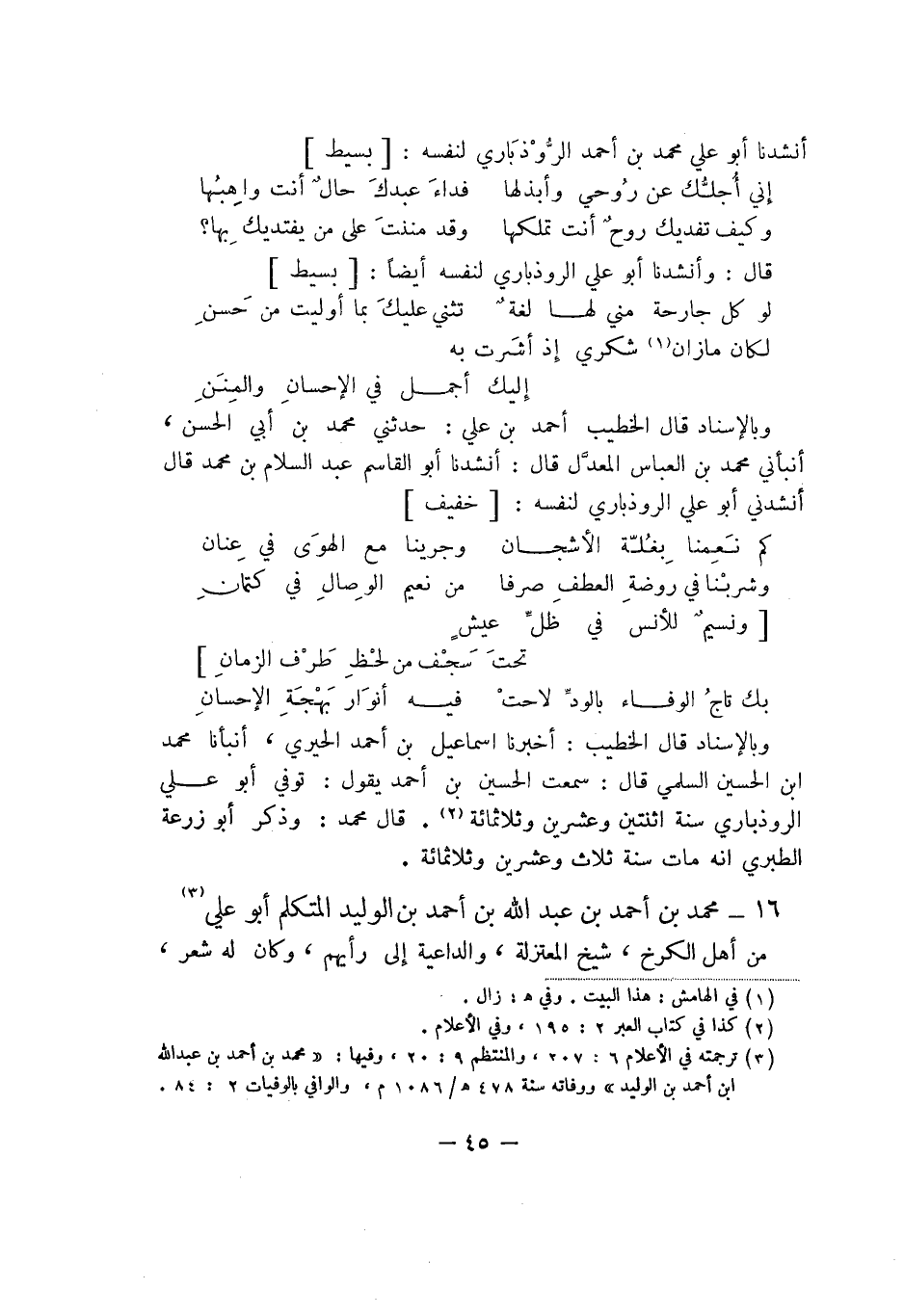 وبالإسناد قال الخطيب أحمد بن علي: حدثني محمد بن أبي الحسن، أنبأني محمد بن العباس المعدل قال: أنشدنا أبو القاسم عبد السلام بن محمد قال أنشدني أبو علي الروذباري لنفسه: خفيف