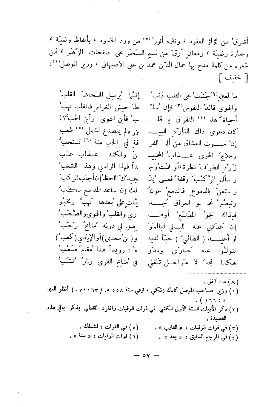 أشرقُ من لؤلؤ العقود، ونثره أنور من ورد الخدود، بألفاظ وضيّة، وعبارة رضيّة، ومعانٍ أرقّ من نسيم السَّحَر على صفحات الزَّهَر، فمن شعره من كلمة مدح بها جمال الدين محمد بن علي الأصبهاني، وزير الموصل: خفيف