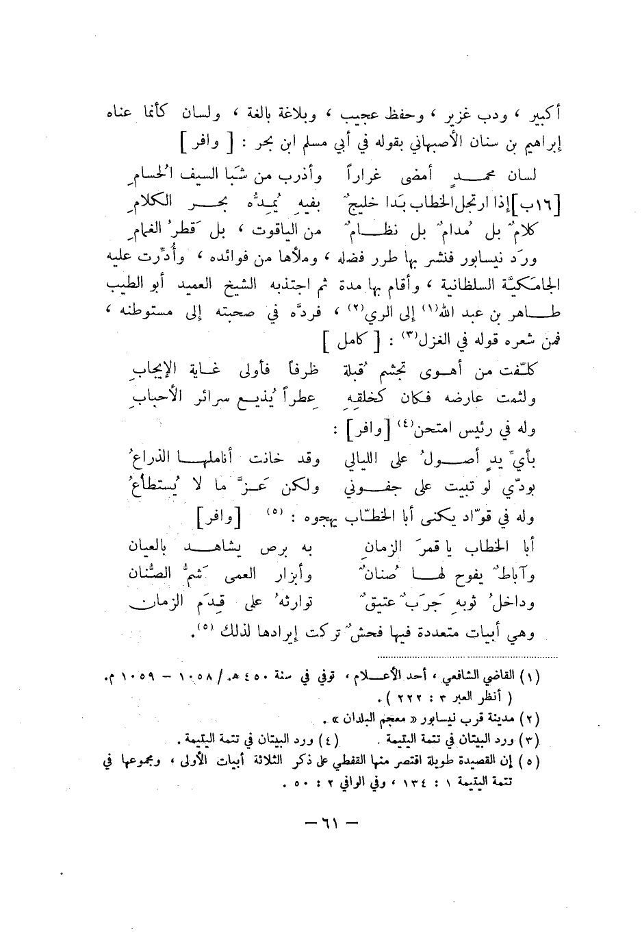 أكبير، ودب غزير، وحفظ عجيب، وبلاغة بالغة، ولسان كأنما عناه إبراهيم بن سنان الأصبهاني بقوله في أبي مسلم ابن بحر: وافر