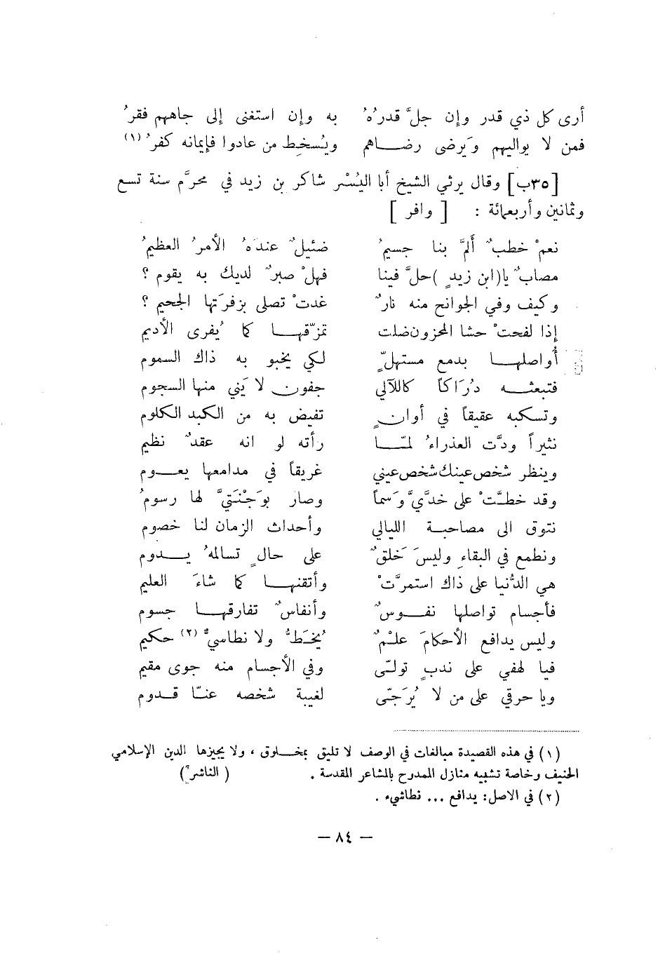وقال يرثي الشيخ أبا اليُسْر شاكر بن زيد في محرَّم سنة تسع وثمانين وأربعمائة: وافر