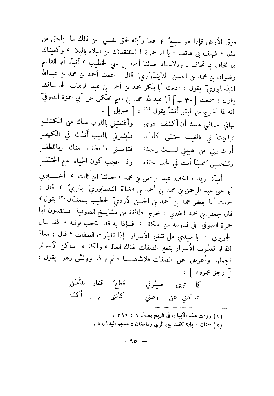 أنبأنا زيد، أخبرنا عبد الرحمن بن محمد، حدثنا ابن ثابت، أخبرني أبو علي عبد الرحمن بن محمد بن أحمد بن فضالة النيسابوريّ بالريّ، قال: سمعت أبا جعفر محمد بن أحمد بن الحسن الأزديّ الخطيب بسمنَان يقول، قال جعفر بن محمد الخلدي: خرج طائفة مشايخ الصوفيّة يستقبلون أبا حمزة الصوفي في قدومه من مكة، فإذا به قد شحب لونه، فقال الجريري: يا سيدي هل تتغير الأسرار إذا تغيرت الصفات؟ قال: معاذ الله لو تغيرت الأسرار بتغير الصفات لهلك العالم، ولكنه ساكن الأسرار فجملها وأعرض عن الصفات فلاشاها، ثم تركنا وولَّى وهو يقول: رجز مجزوء: