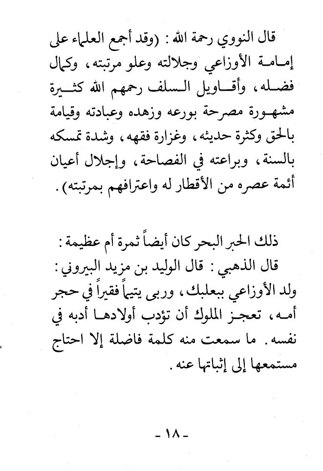 قال النووي رحمه الله: (وقد أجمع العلماء على إمامة الأوزاعي وجلالته وعلو مرتبته، وكمال فضله، وأقاويل السلف رحمهم الله كثيرة مشهورة مصرحة بورعه وزهده وعبادته وقيامه بالحق وكثرة حديثه، وغزارة فقهه، وشدة تمسكه بالسنة، وبراعته في الفصاحة-، وإجلال أعيان أئمة عصره من الأقطار له واعترافهم بمرتبته)