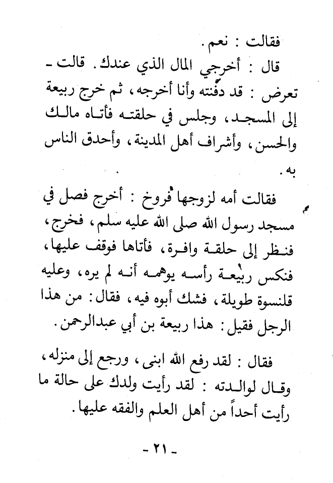 قال: أخرجي المال الذي عندك. قالت: تعرض: قد دفنته وأنا أخرجه، ثم خرج ربيعة إلى المسجد، وجلس في حلقته- فأتاه مالك والحسن، وأشراف أهل المدينة، وأحدق الناس به.