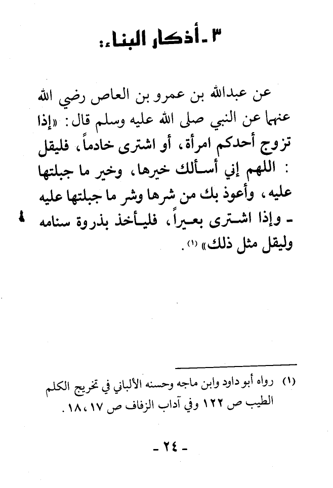 عن عبد الله بن عمرو بن العاص رضي الله عنهما عن النبي صلى الله عليه وسلم قال: "إذا تزوج أحدكم امرأة، أو اشترى خادما، فليقل: اللهم إني أسألك خيرها، وخير ما جبلتها عليه، وأعوذ بك من شرها وشر ما جبلتها عليه- وإذا اشترى بعيراً، فليأخذ بذروة سنامه وليقل مثل ذلك ".