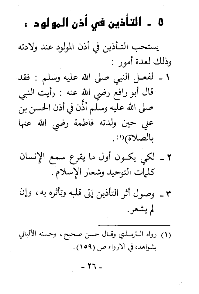 1 - لفعل النبي صلى الله عليه وسلم: فقد قال أبو رافع رضي الله عنه: رأيت النبي صلى الله عليه وسلم أذن في أذن الحسن بن علي حين ولدته فاطمة رضي الله عنها بالصلاة.