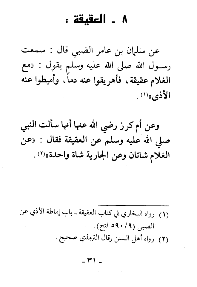 عن سلمان بن عامر الضبي قال: سمعت رسول الله صلى الله عليه وسلم يقول: "مع الغلام عقيقة، فأهريقوا عنه دما، وأميطوا عنه الأذى".