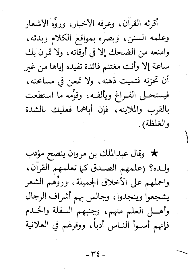 أقرئه القرآن، وعرفه الأخبار، وروه الأشعار وعلمه السنن، وبصره بمواقع الكلام وبدئه، وامنعه من الضحك إلا في أوقاته، ولا تمرن بك ساعة إلا وأنت مغتنم فائدة تفيده إياها من غير أن تحزنه فتميت ذهنه، ولا تمعن في مسامحته، فيستحلي الفراغ ويألفه، وقومه ما استطعت بالقرب والملاينة، فإن أباهما فعليك بالشدة والغلظة).