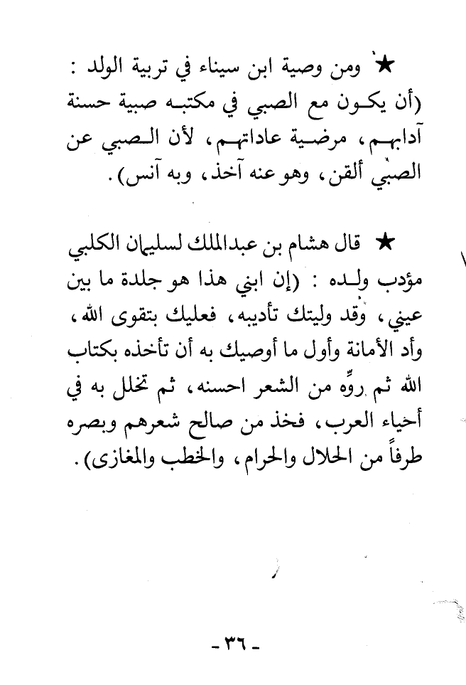 * قال هشام بن عبد الملك لسليمان الكلبي مؤدب ولده: (إن ابني هذا هو جلدة ما بين عيني، وقد وليتك تأديبه، فعليك بتقوى الله، وأد الأمانة وأول ما أوصيك به أن تأخذه بكتاب الله ثم روه