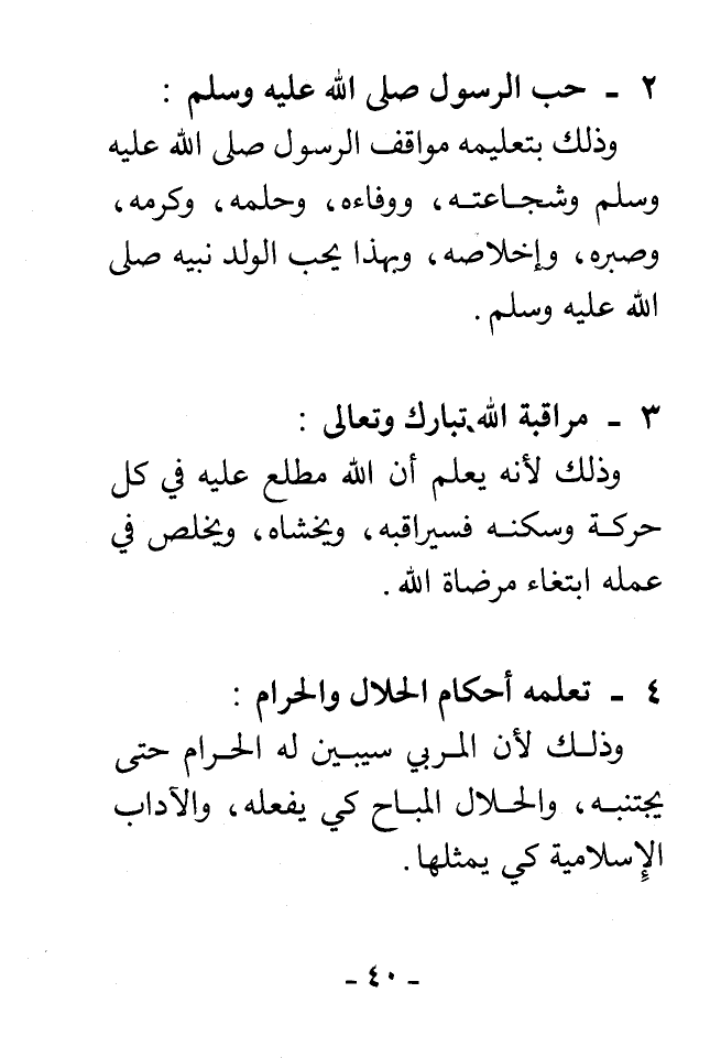 2 - حب الرسول صلى الله عليه وسلم: وذلك بتعليمه مواقف الرسول صلى الله عليه وسلم وشجاعته، ووفاءه، وحلمه، وكرمه، وصبره، وإخلاصه، وبهذا يحب الولد نبيه صلى الله عليه وسلم.
