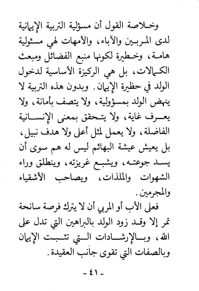 وخلاصة القول أن مسئولية التربية الإيمانية لدى المربين والآباء، والأمهات لهي مسئولية هامة، وخطيرة لكونها منبع الفضائل ومبعث الكمالات، بل هي الركيزة الأساسية لدخول الولد في حظيرة الإيمان. وبدون هذه التربية لا ينهض الولد بمسؤولية، ولا يتصف بأمانة، ولا يعرف غاية، ولا يتحقق بمعنى الإنسانية الفاضلة، ولا يعمل لمثل أعلى ولا هدف نبيل، بل يعيش عيشة البهائم ليس له هم سوى أن يسد جوعته، ويشبع غريزته، وينطلق وراء الشهوات والملذات، ويصاحب الأشقياء والمجرمين.