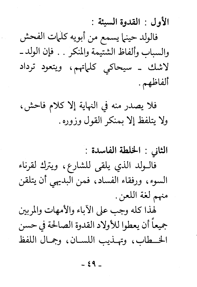 لهذا كله وجب على الآباء والأمهات والمربين جميعاً أن يعطوا للأولاد القدوة الصالحة في حسن الخطاب، وتهذيب اللسان، وجمال اللفظ