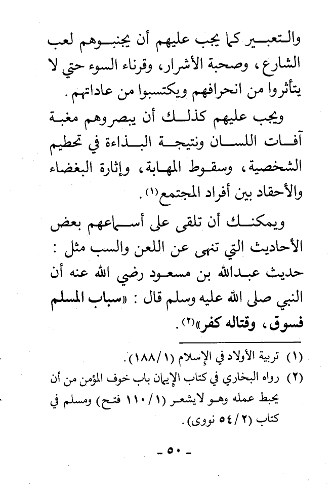 ويمكنك أن تُلقى على أسماعهم بعض الأحاديث التي تنهى عن اللعن والسب مثل: حديث عبد الله بن مسعود رضي الله عنه أن النبي صلى الله عليه وسلم قال: "سباب المسلم فسوق، وقتاله كفر".