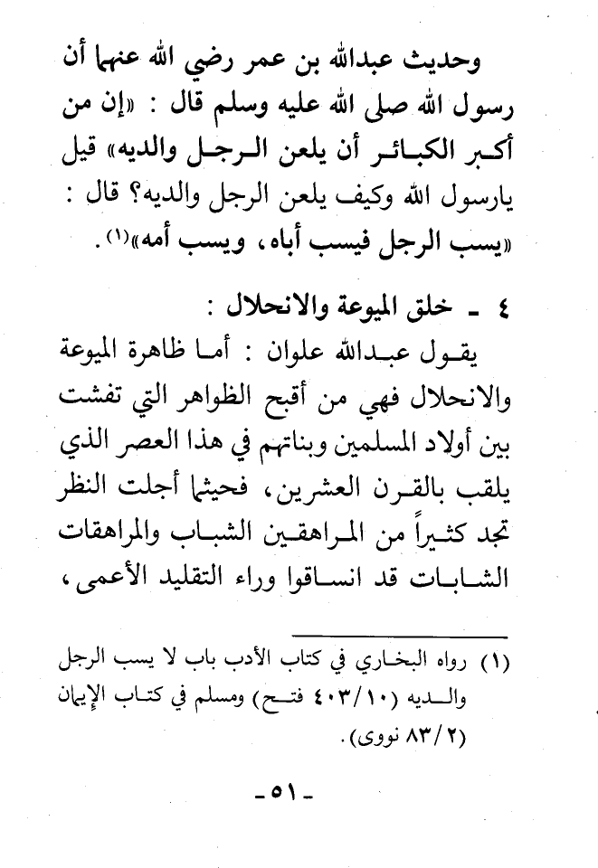 وحديث عبد الله بن عمر رضي الله عنهما أن رسول الله صلى الله عليه وسلم قال: "إن من أكبر الكبائر أن يلعن الرجل والديه " قيل يا رسول الله وكيف يلعن الرجل والديه؟ قال: "يسب الرجل فيسب أباه، ويسب أمه".