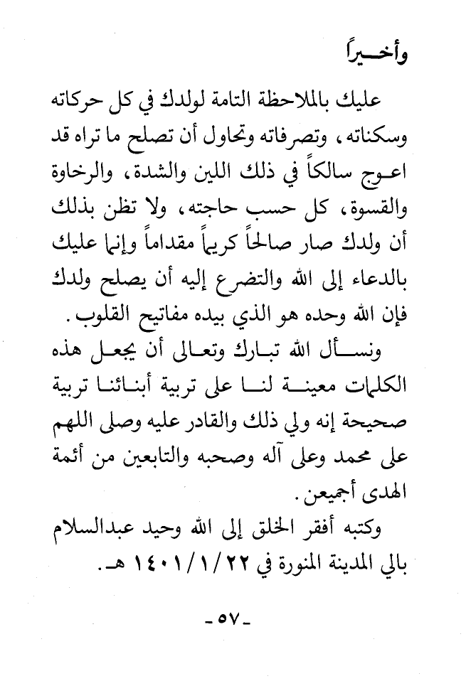 ونسأل الله تبارك وتعالى أن يجعل هذه الكلمات معينة لنا على تربية أبنائنا تربية صحيحة إنه ولي ذلك والقادر عليه وصلى اللهم على محمد وعلى آله وصحبه والتابعين من أئمة الهدى أجمعين.