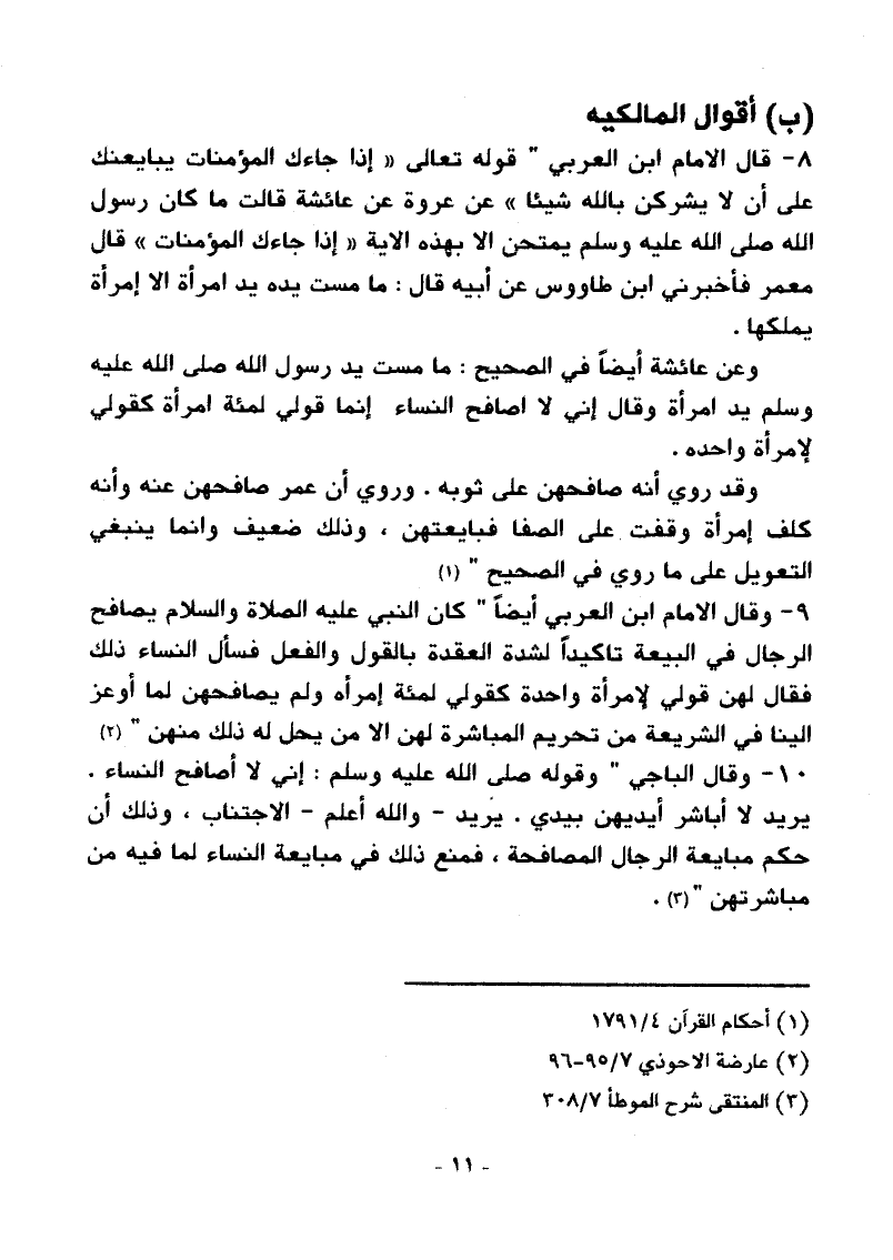 9. وقال الإمام ابن العربي أيضاً: [كان النبي - صلى الله عليه وسلم - يصافح الرجال في البيعة تأكيداً لشدة العقدة بالقول والفعل فسأل النساء ذلك فقال لهن قولي لامرأة واحدة كقولي لمائة امرأة ولم يصافحهن لما أوعز إلينا في الشريعة من تحريم المباشرة لهن إلا من يحل له ذلك منهن]. (¬2)