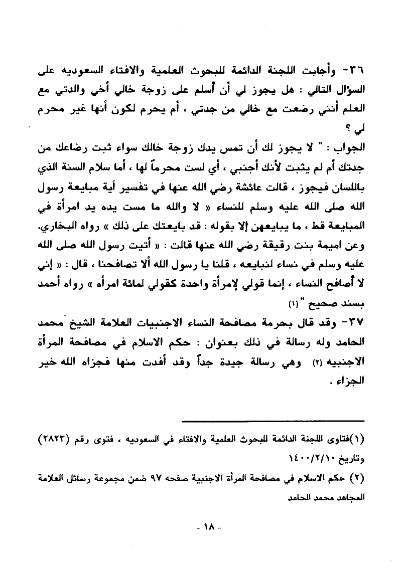37. وقد قال بحرمة مصافحة النساء الأجنبيات العلامة الشيخ محمد الحامد وله رسالة في ذلك بعنوان "حكم الإسلام في مصافحة المرأة الأجنبية ". (¬2)