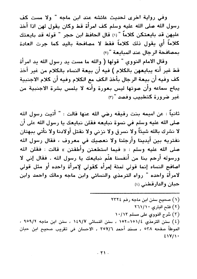 ثانياً: عن أميمة بنت رقيقة رضي الله عنها قالت: [أتيت رسول الله - صلى الله عليه وسلم - في نسوة نبايعه فقلن نبيعك يا رسول الله على أن لا نشرك بالله شيئاً ولا نسرق ولا نزني ولا نقتل أولادنا ولا نأتي ببهتان نفتريه بين أيدينا وأرجلنا ولا نعصيك في معروف، فقال رسول الله - صلى الله عليه وسلم - (فيما استطعتن وأطقتن)، قالت: فقلن الله ورسوله أرحم بنا من أنفسنا هلم نبايعك يا رسول الله. فقال: (إني لا أصافح النساء إنما قولي لمائة امرأة كقولي لامرأة واحدة أو مثل قولي لامرأة واحدة)] رواه