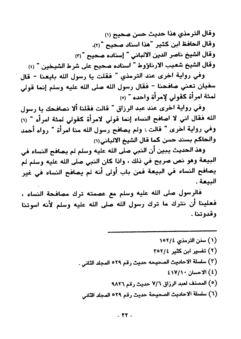 وفي رواية أخرى عند الترمذي: (فقلت: يا رسول الله بايعنا - قال سفيان تعني صافحنا - فقال رسول الله - صلى الله عليه وسلم - إنما قولي لمئة امرأة كقولي لامرأة واحدة). (¬5)