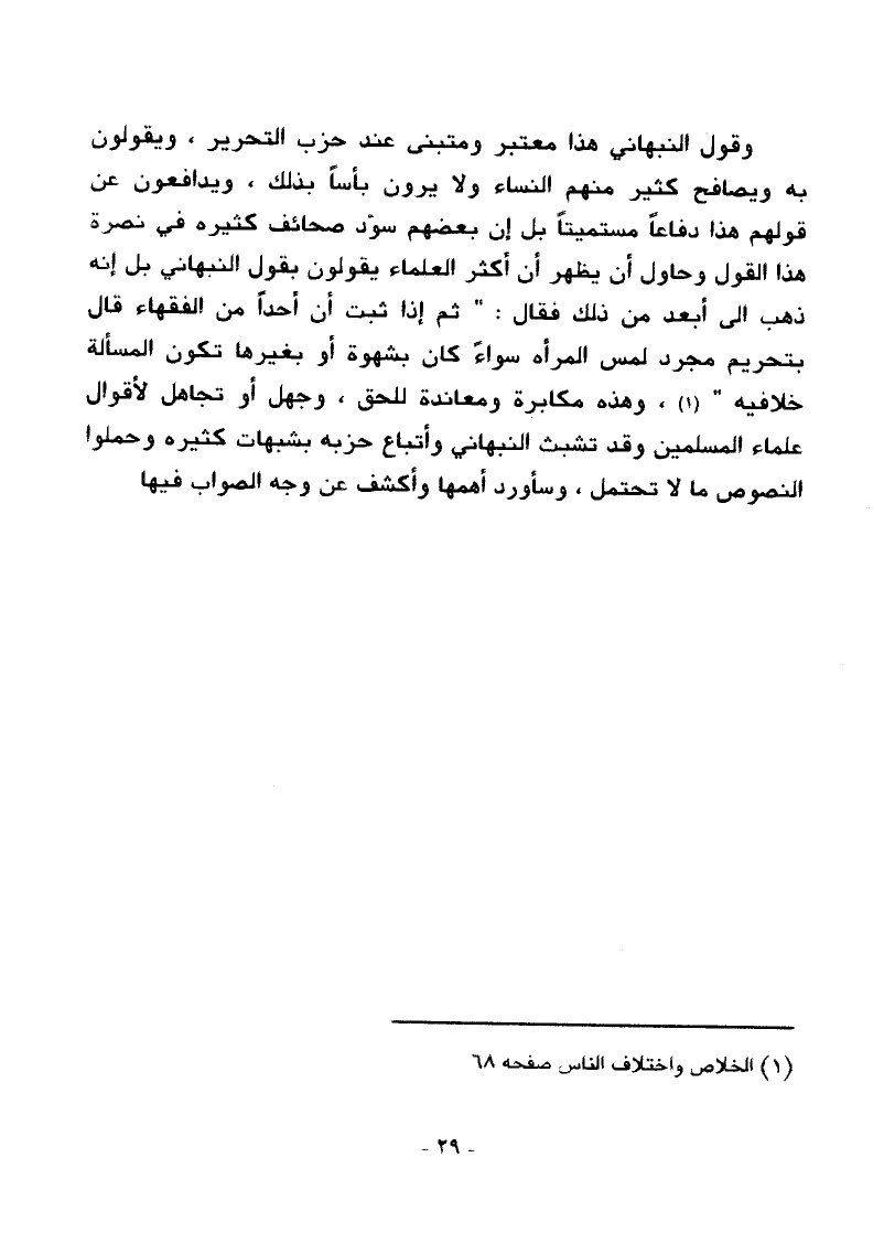وقول النبهاني هذا معتبر ومتبنى عند حزب التحرير ويقولون به ويصافح كثير منهم النساء ولا يرون بأساً بذلك، ويدافعون عن قولهم هذا دفاعاً مستميتاً بل عن بعضهم سود صحائف كثيرة في نصرة هذا القول وحاول أن يظهر أن أكثر العلماء يقولون بقول النبهاني بل إنه ذهب إلى أبعد من ذلك فقال: [ثم إذا ثبت أن أحداً من الفقهاء قال بتحريم مجرد لمس المرأة سواءً كان بشهوة أو بغيرها تكون المسألة خلافية]. (¬1)