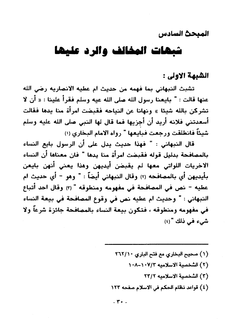 وهو - أي حديث أم عطية - نص في المصافحة في مفهومه ومنطوقه] (¬3) وقال أحد أتباع النبهاني: [وحديث أم عطية نص في وقوع المصافحة ببيعة النساء في مفهومه ومنطوقه، فتكون بيعة النساء بالمصافحة جائزة شرعاً ولا شيء في ذلك]. (¬4)