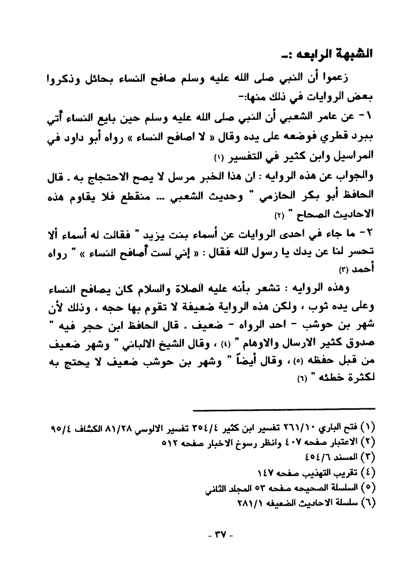 1. عن عامر الشعبي أن النبي - صلى الله عليه وسلم - حين بايع النساء أتي ببرد قطري فوضعه على يده وقال: (لا أصافح النساء) رواه أبو داود في المراسيل وابن كثير في التفسير. (¬1)