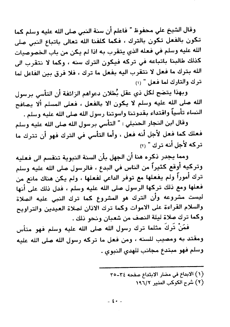 وقال الشيخ علي محفوظ: [فاعلم أن سنة النبي - صلى الله عليه وسلم - كما تكون بالفعل تكون بالترك، فكما كلفنا الله تعالى باتباع النبي - صلى الله عليه وسلم - في فعله الذي يتقرب به إذا لم يكن من باب الخصوصيات كذلك طالبنا في تركه فيكون الترك سنة، وكما لا نتقرب إلى الله بترك ما فعل لا نتقرب إليه بفعل ما ترك، فلا فرق بين الفاعل لما ترك والتارك لما فعل]. (¬1)