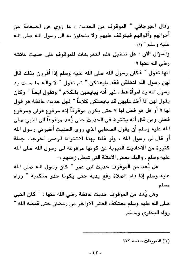 وقال الجرجاني: [الموقوف من الحديث: ما روي عن الصحابة من أحوالهم وأقوالهم فيتوقف عليهم ولا يتجاوز به إلى رسول الله - صلى الله عليه وسلم -]. (¬1)