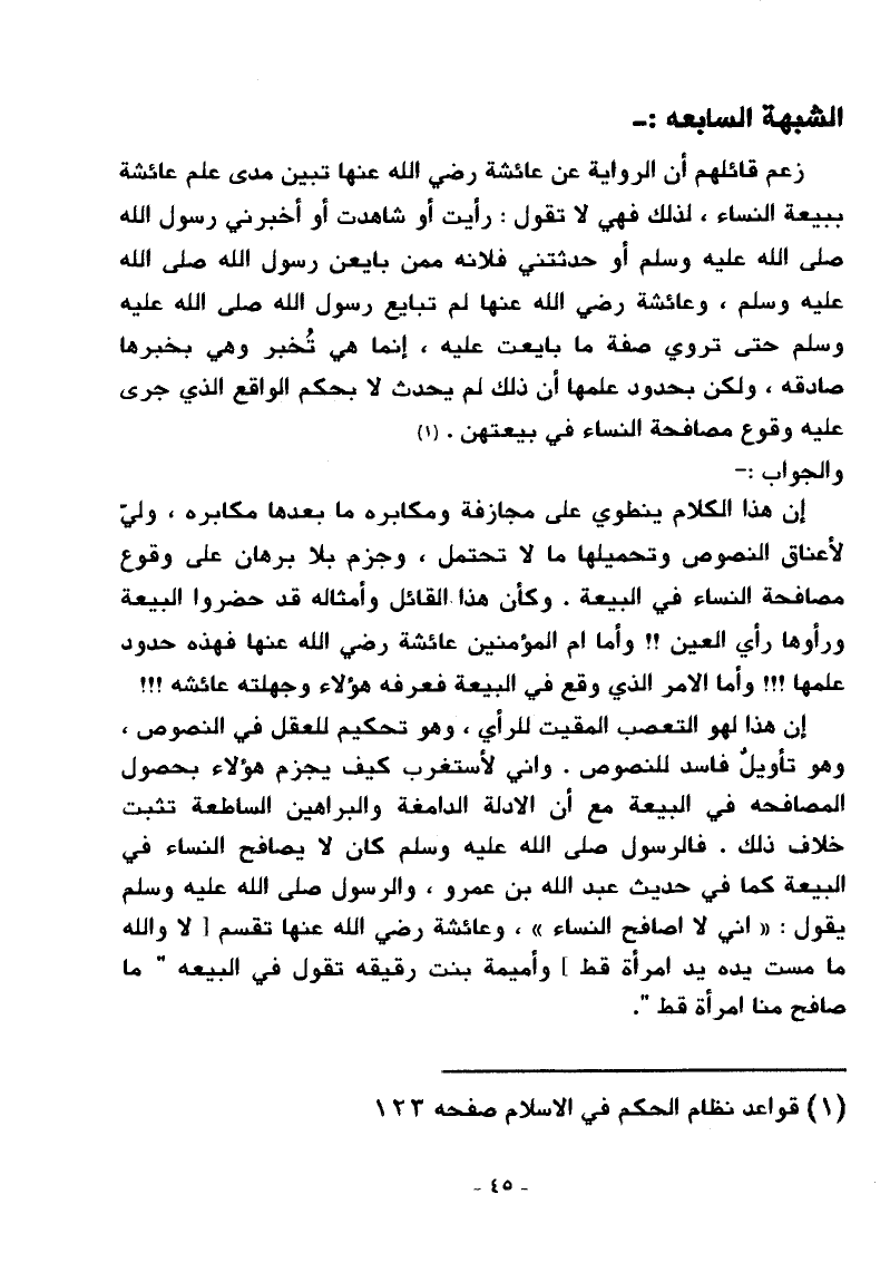 والجواب: إن هذا الكلام ينطوي على مجازفة ومكابرة ما بعدها مكابرة، وليّ لأعناق النصوص وتحميلها ما لا تحتمل، وجزم بلا برهان على وقوع مصافحة النساء في البيعة. وكأن هذا القائل وأمثاله قد حضروا البيعة ورأوها رأي العين!! وأما أم المؤمنين عائشة رضي الله عنها فهذه حدود علمها!! وأما الأمر الذي وقع في البيعة فعرفه هؤلاء وجهلته عائشة!! إن هذا لهو التعصب المقيت للرأي، وهو تحكيم للعقل في النصوص، وهو تأويل فاسد للنصوص. وإني لأستغرب كيف يجزم هؤلاء بحصول المصافحة في البيعة مع أن الأدلة الدامغة والبراهين الساطعة تثبت خلاف ذلك. فالرسول - صلى الله عليه وسلم -