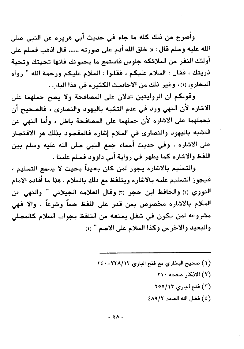 والنصارى، فالصحيح أن نحملهما على الإشارة لأن حملهما على المصافحة باطل، وأما النهي عن التشبه باليهود والنصارى في السلام إشارة فالمقصود بذلك هو الاقتصار على الإشارة. وفي حديث أسماء جمع النبي - صلى الله عليه وسلم - بين اللفظ والإشارة كما يظهر في رواية أبي داود فسلم علينا.