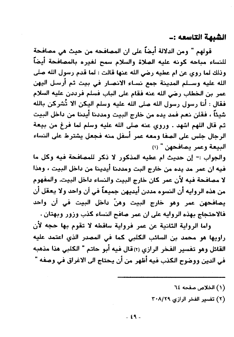 والجواب: إن حديث أم عطية المذكور لا ذكر للمصافحة فيه وكل ما فيه: (أن عمر مد يده من خارج البيت ومددنا أيدينا من داخل البيت) وهذا لا مصافحة فيه لأن عمر كان خارج البيت والنساء داخل البيت. والمفهوم من هذه الرواية أن النسوة مددن أيديهن جميعاً في آن واحد ولا