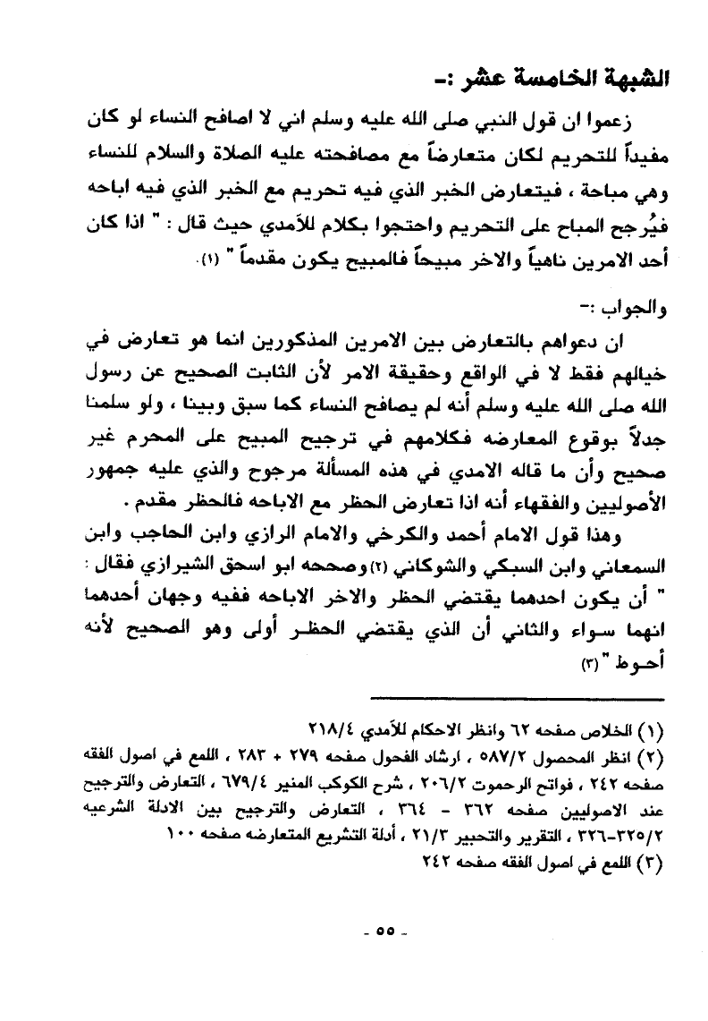 والجواب: إن دعواهم بالتعارض بين الأمرين المذكورين إنما هو تعارض في خيالهم فقط لا في الواقع وحقيقة الأمر، لأن الثابت الصحيح عن رسول الله - صلى الله عليه وسلم - أنه لم يصافح النساء كما سبق وبينا، ولو سلمنا جدلاً بوقوع المعارضة فكلامهم في ترجيح المبيح على المحرم غير صحيح وأن ما قاله الآمدي في هذه المسألة مرجوح والذي عليه جمهور الأصوليين والفقهاء أنه إذا تعارض الحظر مع الإباحة فالحظر مقدم.