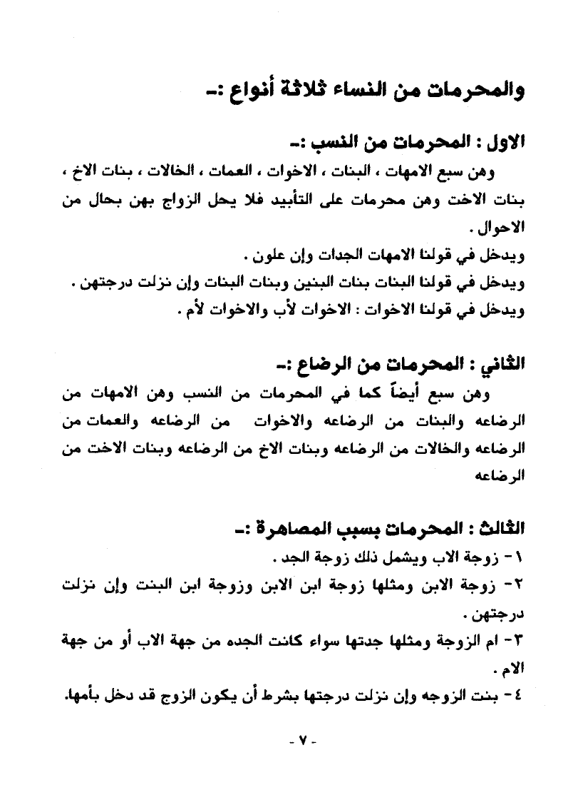 وهن سبع الأمهات، البنات، الأخوات، العمات، الخالات، بنات الأخ، بنات الأخت، وهن محرمات على التأبيد فلا يحل الزواج بهن بحال من الأحوال.