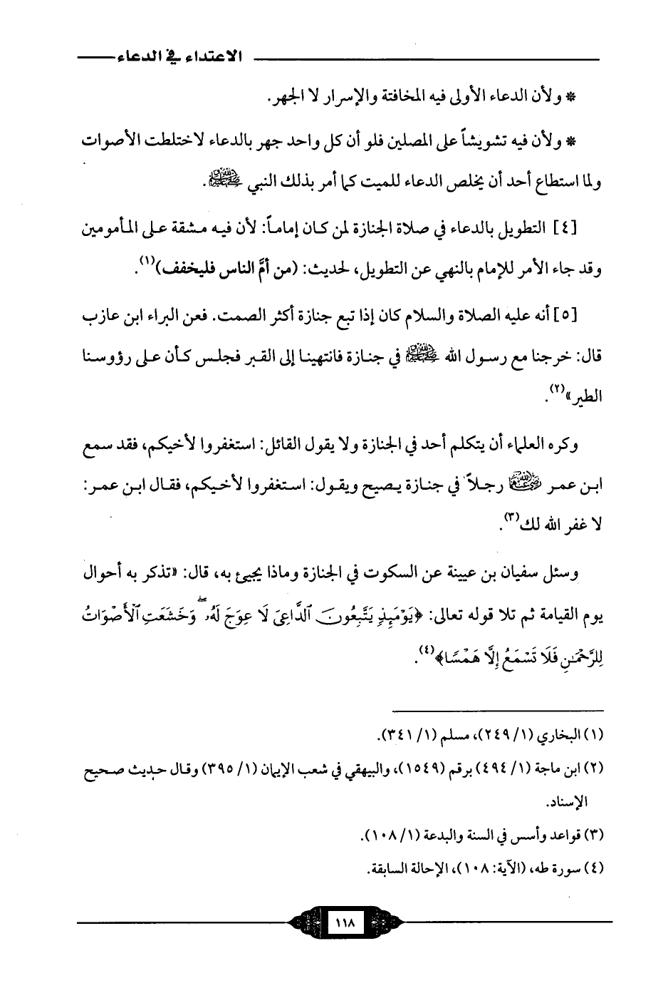 وسئل سفيان بن عيينة عن السكوت في الجنازة وماذا يجيء به، قال: (تذكر به أحوال يوم القيامة ثم تلا قوله تعالى: {يَوْمَئِذٍ يَتَّبِعُونَ الدَّاعِيَ لَا عِوَجَ لَهُ وَخَشَعَتِ الْأَصْوَاتُ لِلرَّحْمَنِ فَلَا تَسْمَعُ إِلَّا هَمْسًا} [طه: 108].