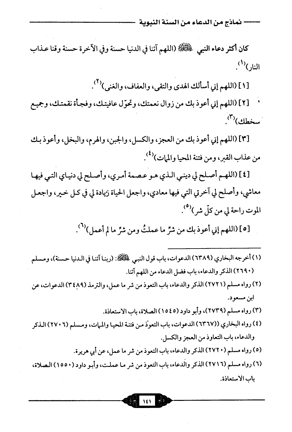 4 - «اللهم أصلح لي ديني الذي هو عصمة أمري، وأصلح لي دنياي التي فيها معاشي، وأصلح لي آخرتي التي فيها معادي، واجعل الحياة زيادة لي في كل خير، واجعل الموت راحة لي من كل شر» (¬5).