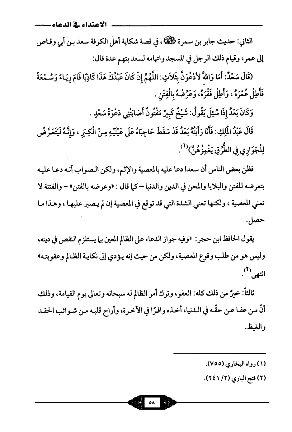 الثاني: حديث جابر بن سمرة- رضي الله عنه- في قصَّة شكاية أهل الكوفة سعد بن أبي وقَّاص إلى عمر، وقيام ذلك الرَّجل في المسجد واتِّهامه لسعد بتهم عدَّة قال:
